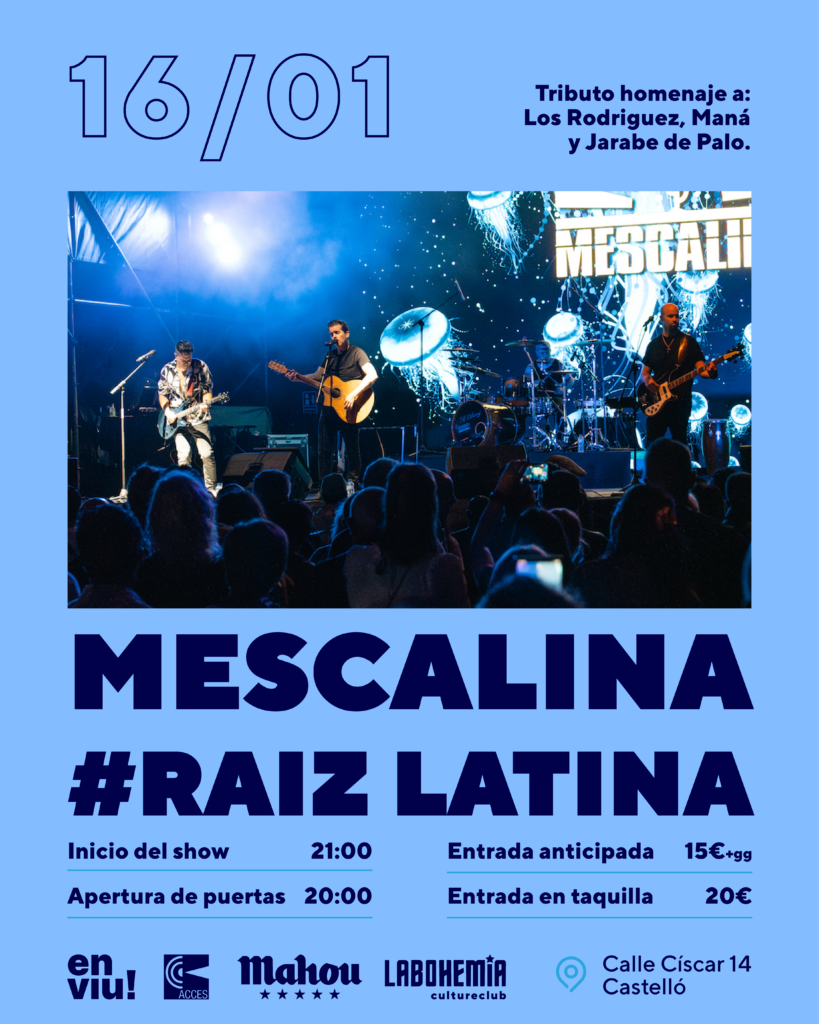 MESCALINA presenta un nou show tribut a tres bandes que van crear cançons inoblidables del rock en espanyol com són Los Rodríguez, Jarabe de Palo i Maná. Tres passes, cadascú dedicat a una de les tres bandes, amb un directe enèrgic interpretat per músics amb gran experiència i qualitat. Carregats de bona energia i on tots i totes cantem a l’uníson.