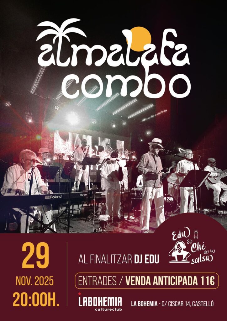 El dissabte 29 de novembre retornen a La Bohemia els castellonencs Almalafa Combo. Les portes s’obrin a partir de les 19.00 h i el concert començarà a les 20.00 h. Les entrades anticipades estan disponibles des de 10 €. En taquilla es poden aconseguir pel mateix preu