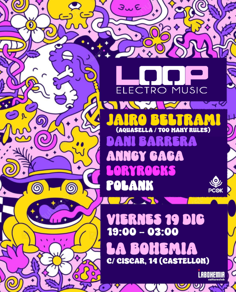 El divendres 19 de desembre La Bohemia es convertirà en el centre de l’electrònica a Castelló amb ‘LOOP Electro Music’. La millor música electrònica sonarà ininterrompudament des de les 19.00 h fins a les 03.00 h. Les entrades anticipades estan disponibles des de 12 € (amb accés i consumició fins a les 21.00 h) o per 15 € (amb accés i consumició a partir de les 21.00 h). En taquilla es poden aconseguir per 20 €.