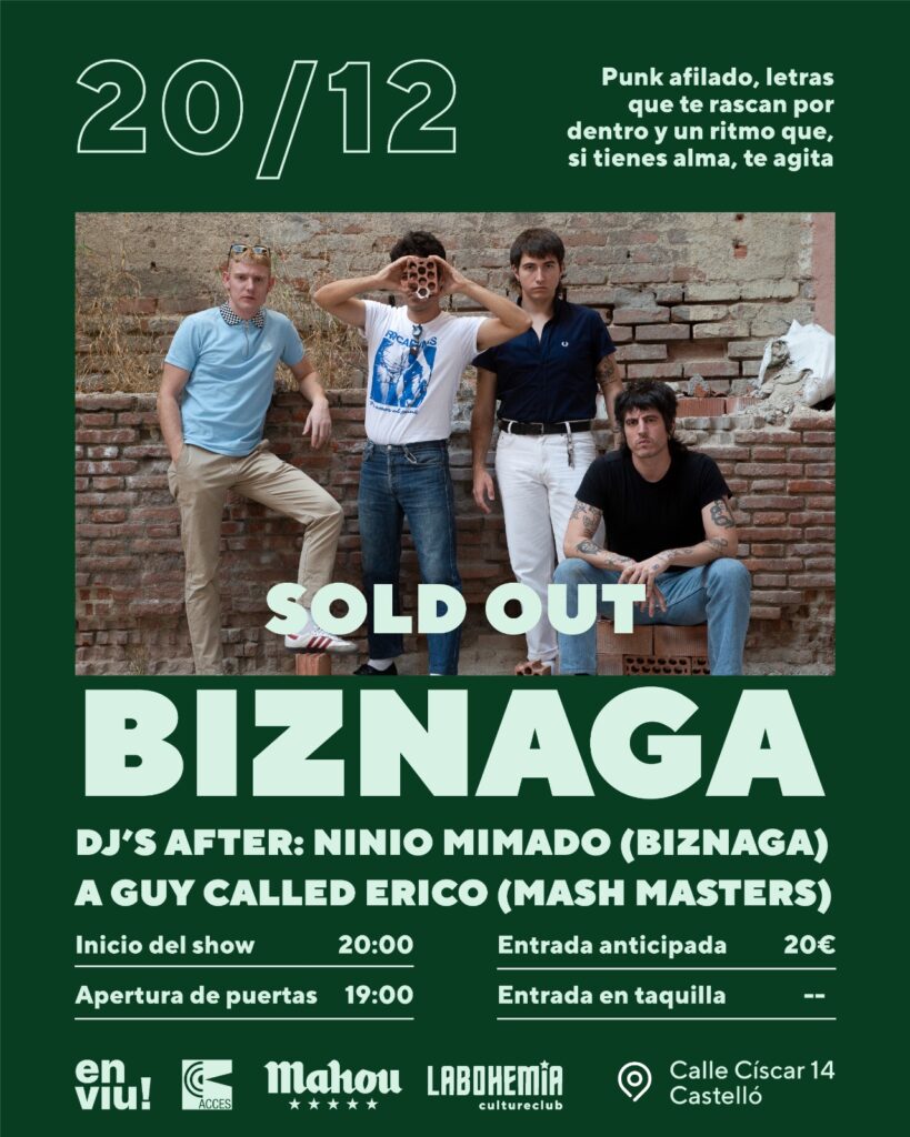 El dissabte 20 de desembre tindrem un dels concerts més esperats de la temporada a La Bohemia: els madrilenys Biznaga. A aquesta cita els acompanyaran els dj’s Ninio Mimado (Biznaga) i A Guy Called Erico (Mash Masters) per arredonir i allargar la nit. El concert serà a les 20.00 h. Ja no es poden aconseguir entrades perquè el concert ha colgat el cartell de ‘sold out’.