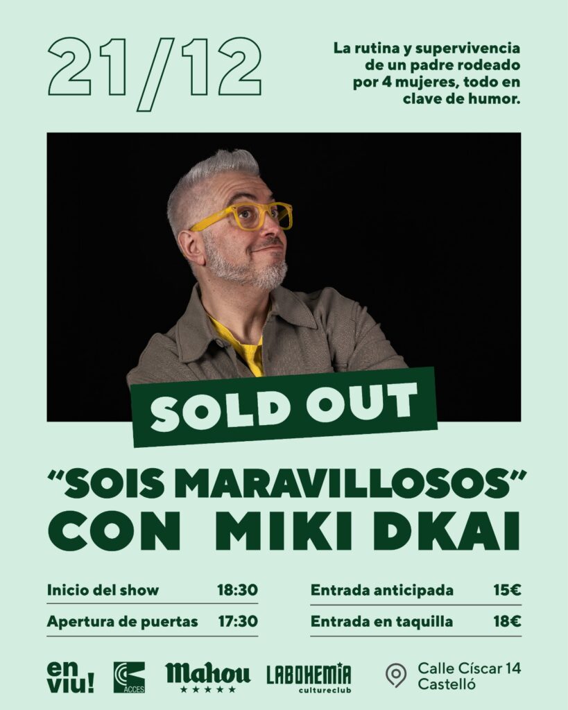 Tanquem la programació setmanal amb el monòleg ‘Sois maravillosos’ de Miki Dkai el 21 de desembre. Les portes s’obrin a partir de les 17.30 h i es podrà gaudir del monòleg a les 18.30 h. L’espectacle ha fet ‘sold out’, per la qual cosa ja no hi han entrades disponibles.