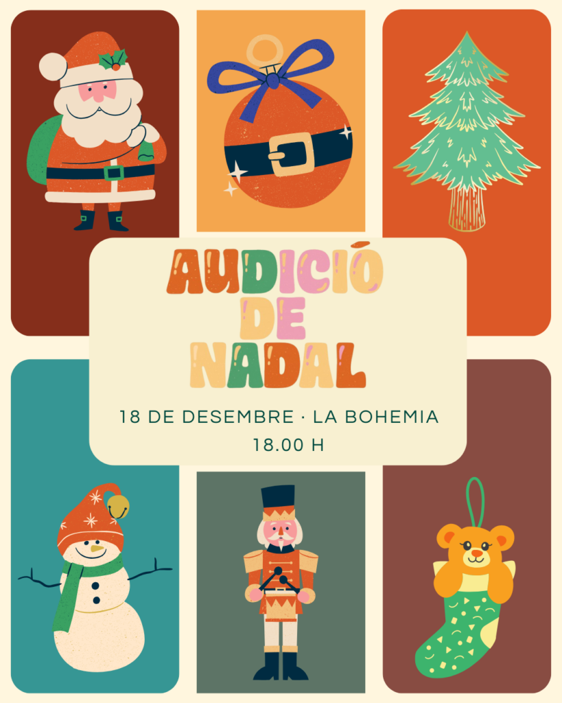 Tots junts celebrarem l’arribada de la festivitat amb nadales i altres cançons. Junt amb els professors del centre, tindrem peces amb la guitarra, bateria, piano, cant…tot un repertori variat i divertit. No et pots perdre aquest acte tan especial i emotiu a La Bohemia.