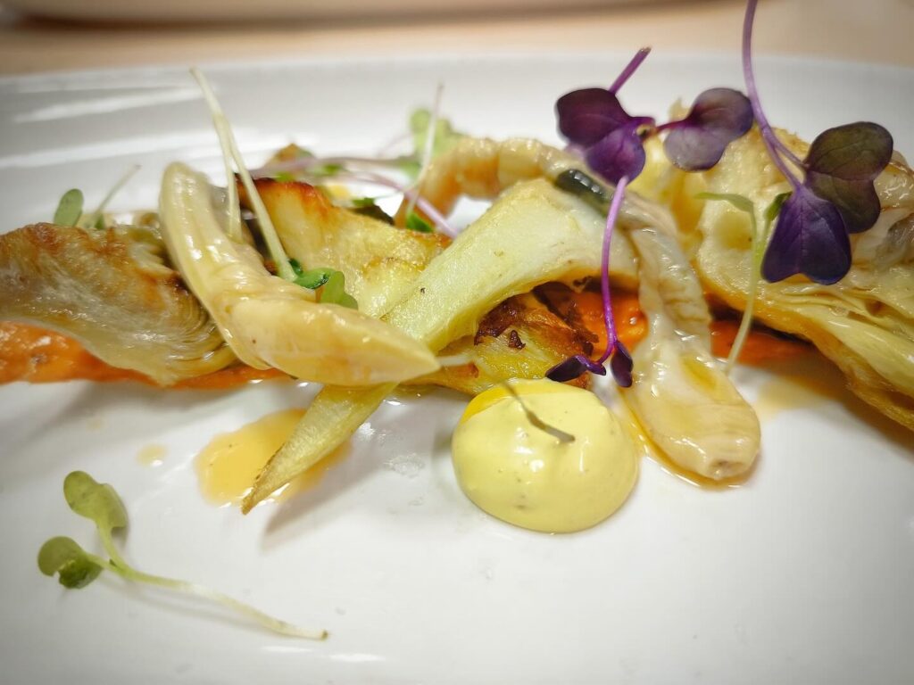 para continuar con la Alcachofa de Torreblanca con salsa de Foie y crujiente de Jamón. Y
