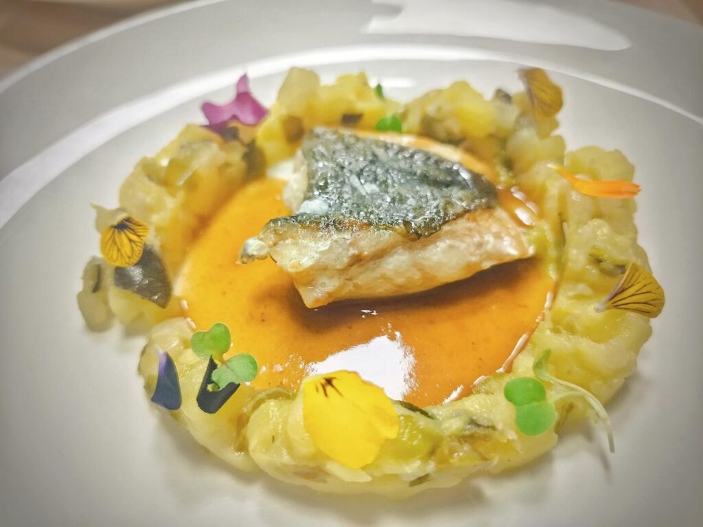 de Costilla Ibérica sobre parmentier de tomillo. Ambas excelentes opciones que complementan una