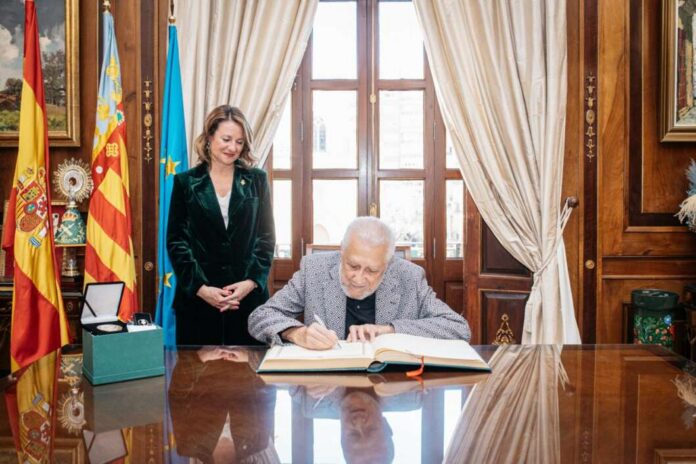 El legendario músico cubano ha sido recibido en el Ayuntamiento por la alcaldesa, Begoña Carrasco, y ha firmado en el libro de honor del consistorio