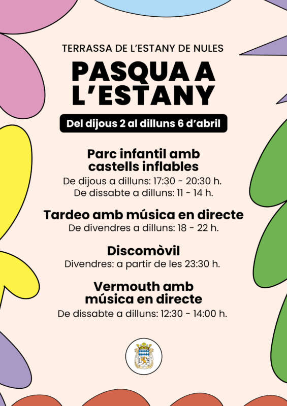 L’Ajuntament de Nules ha organitzat, un any més, una variada programació que comptarà amb diferents activitats que es desenvoluparan des de dijous, 2 d’abril, fins a dilluns, 6 d’abril. Així doncs, la programació 'Pasqua a l’Estany' presenta una oferta d'entreteniment i d’oci per a tots els públics amb actes que tindran lloc els dies coincidents amb les vacances de Setmana Santa i Pasqua.