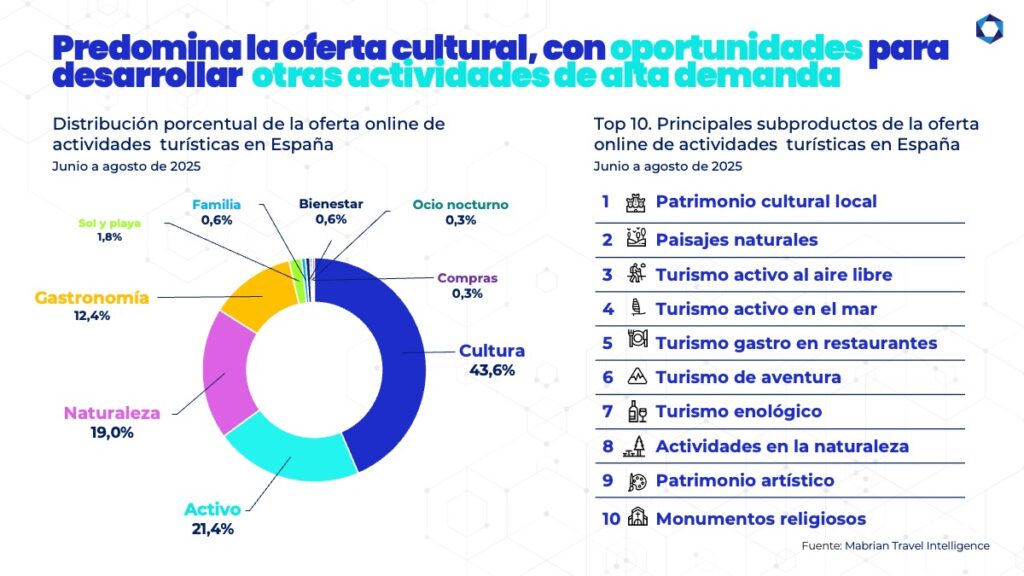 El estudio, elaborado por Mabrian, firma global de inteligencia de datos y asesoría turística para destinos, analiza la oferta de actividades y experiencias turísticas en España y los intereses de la demanda de este tipo de productos a través de las principales plataformas online de este tipo de actividades, Civitatis y GetYourGuide. Para ello se ha analizado tanto en el mercado doméstico, como en cinco mercados internacionales clave: Reino Unido, Alemania, Italia, Francia y Estados Unidos.