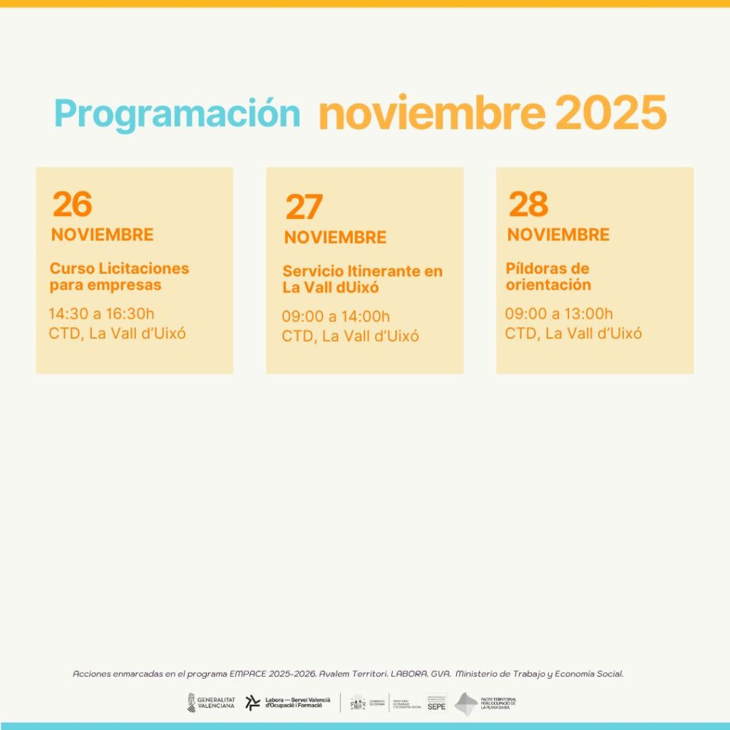 En data 25 i 26 de novembre de 2025, en horari de 14.30 a 16.30 hores, en el Centre de Transformació Digital (La Vall d’Uixó); tindrà lloc la formació de “Licitacions”.