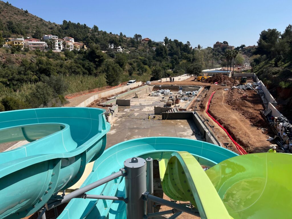 La instalación de los tres toboganes de la piscina grande es simbólica y el paso previo a la pavimentación del suelo de todo el complejo