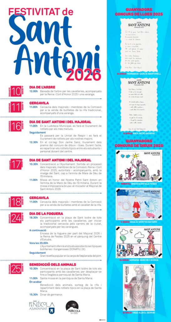 El día 25 a las 10.30h. se celebrará la misa en la Parroquia de Santa María y al acabar se procederá a la bendición de animales en la Plaza Santa María tras la cual se llevará a cabo el sorteo de la rifa.