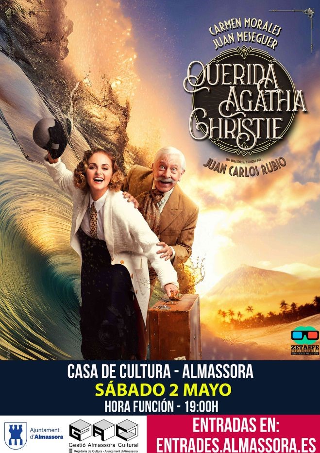 La Casa de la Cultura d’Almassora acollirà el pròxim dissabte 2 de maig la representació de l’obra Querida Agatha Christie, una proposta teatral protagonitzada per Carmen Morales i Juan Meseguer que promet captivar el públic amb una història plena de misteri, emoció i picades d’ullet a la cèlebre escriptora britànica.