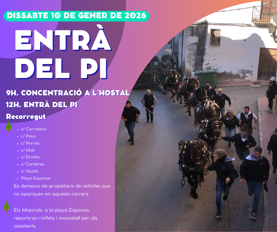 A las 12 del mediodía, los caballos iniciarán l’Entrà del Pi por las siguientes calles: Carretera, Pozos, Las Parres, Molino, Ermita, Pedrera, Alcalá, para finalmente llegar a la plaza España, donde se procederá a plantar la hoguera de Sant Antoni. Finalizada l´Entrà, los mayorales y mayoralas 2026 de Sant Antoni ofrecerán moscatel y ‘rotllets’ de anís a todas las personas asistentes.