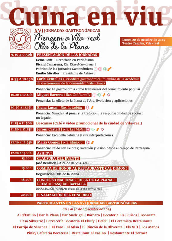 L’esdeveniment, ja consolidat com una de les cites gastronòmiques més importants del calendari local, pretén fer valdre la riquesa culinària de Vila-real i impulsar el sector hostaler de la ciutat a través de propostes que uneixen tradició, innovació i promoció econòmica. “Novembre, a Vila-real, torna a ser el mes de la gastronomia de cullera amb el tradicional tribut a l’Olla de la Plana, una iniciativa que enguany suma 19 establiments participants”, ha destacat Madrigal.